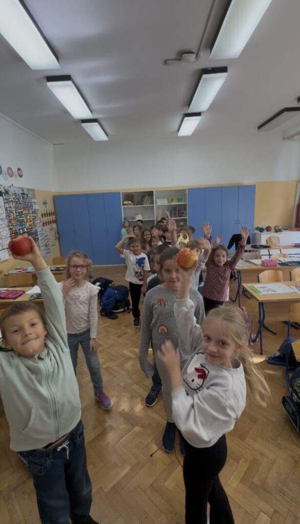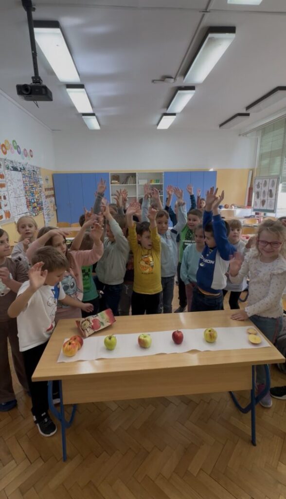 Prošlog tjedna učenici 1.a i 1.b razreda s učiteljicom Helenom u produženom boravku obilježili su Dan jabuka. Kroz različite aktivnosti i zajedničko druženje dan je protekao u veselom i poticajnom ozračju. Učenici su s puno interesa i radosti sudjelovali u aktivnostima i kušanju različitih vrsta jabuka.