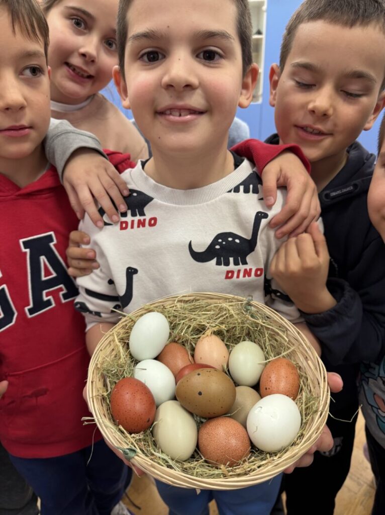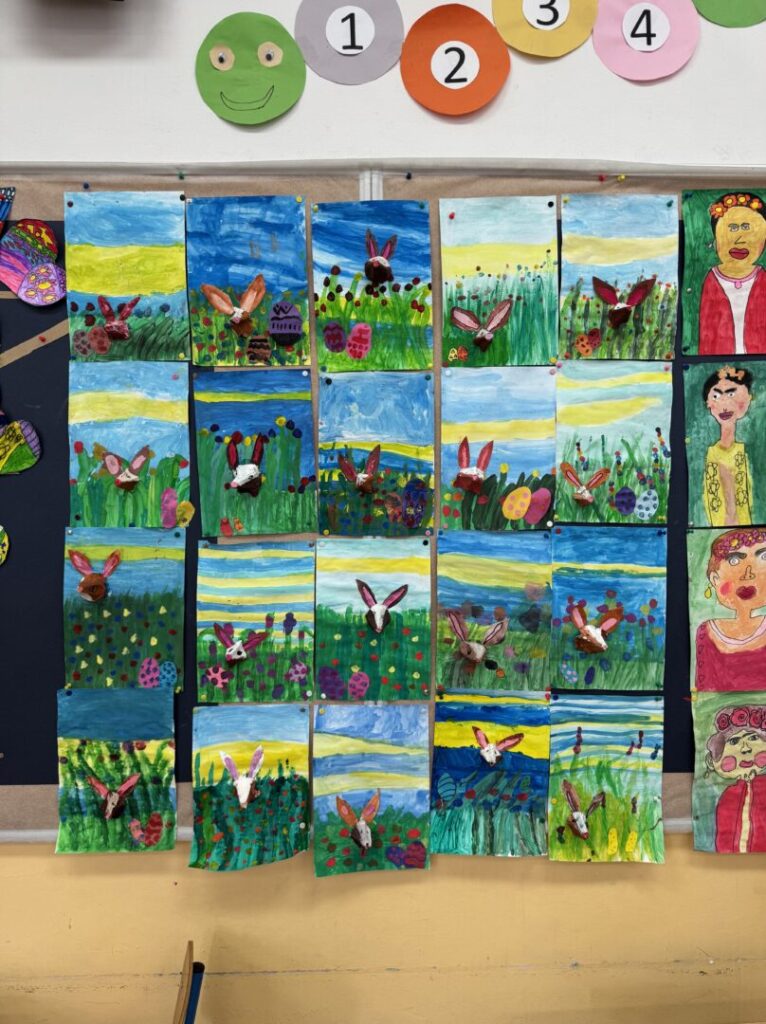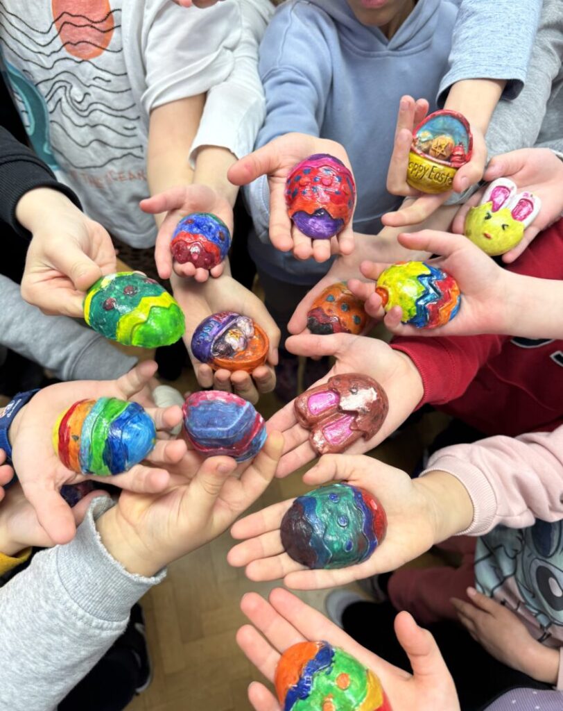 U produženom boravku učenika 1.a i 1.b protekli su dani u veselom uskrsnom ozračju, ispunjeni kreativnošću, učenjem i igrom. Učenici su imali priliku izrađivati uskrsna jaja od gipsa, pri čemu su razvijali svoju maštu i likovne vještine. Posebno zanimanje izazvala su raznobojna jaja egzotičnih kokoši. Djeca su s velikim zanimanjem promatrala razlike u bojama i saznala koja kokoš nese kakvo jaje. Izrađivali smo i zeca u travi koristeći kutije od jaja. Za kraj, veselje je upotpunila potraga za čokoladnim jajima, koja je izmamila osmijehe i dodatno razveselila učenike. Uskrsno vrijeme u produženom boravku proteklo je u zajedništvu, učenju i veselju!